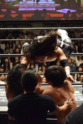 ポーリー、ハイジを場外に出してKUDOと高梨が佐々木にダブルのガットショット(右写真)、