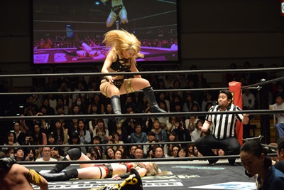 ポーリー高梨に腕パンチ連打、コーナーで踏みつけ、センターに戻してエルボードロップ(左写真)、カウント2。ハイジにタッチ。