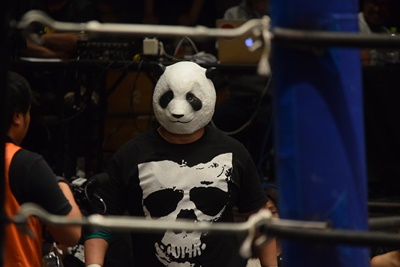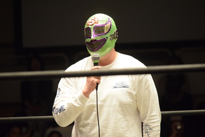 5/28後楽園ホール大会で復帰するスーパーササダンゴマシンが挨拶。(右写真)