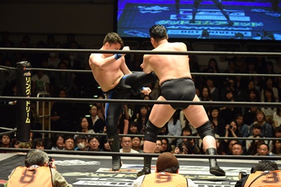 HARASHIMA樋口をコーナーに振って串刺しビッグブーツ(右写真)。