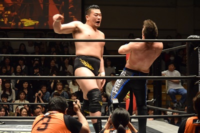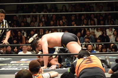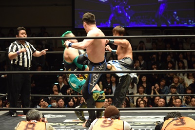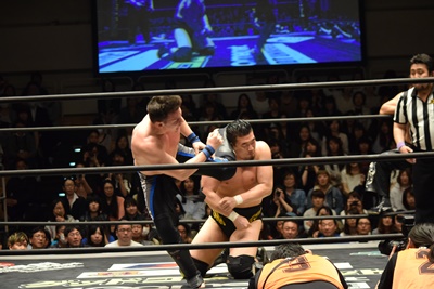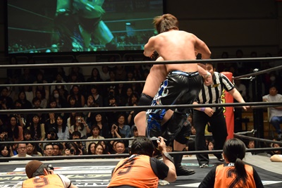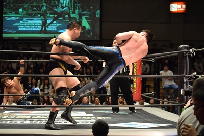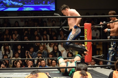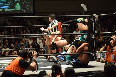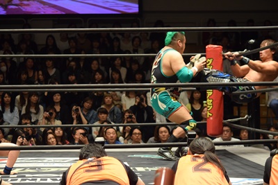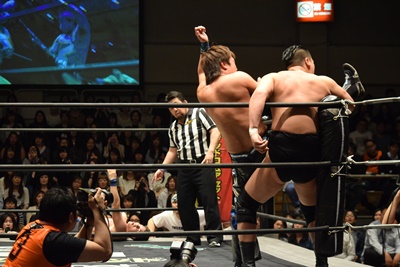 ベイリー樋口を一旦持ち上げてヒザを着かせ、リリースして側頭部にキック(左写真)、HARASHIMAにタッチ。