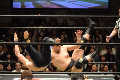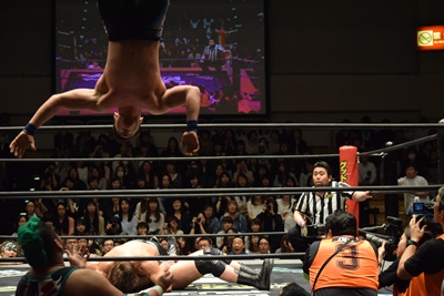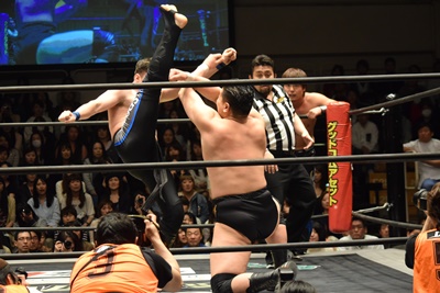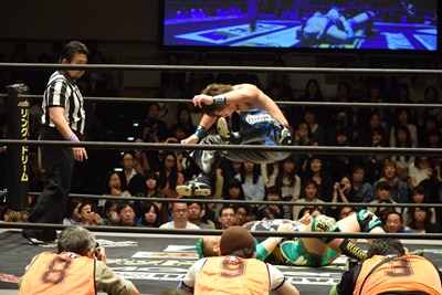 HARASHIMAリバースフランケンシュタイナー、樋口回転を途中で止めて(左写真)、