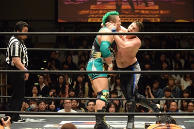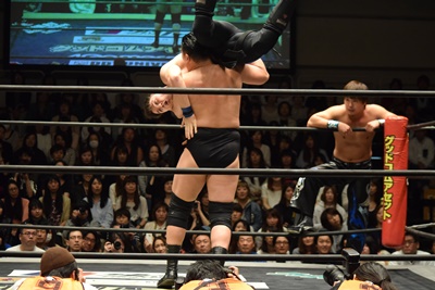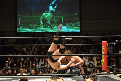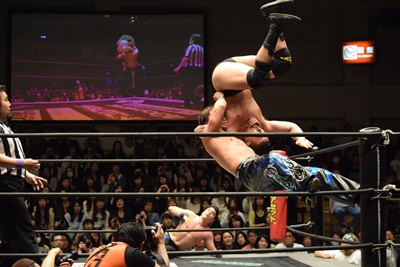 ベイリーがアサイDDT狙う、樋口ブロック、肩に担ぐ(右写真)、