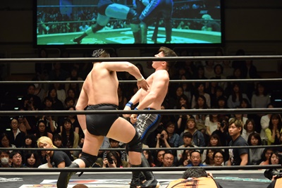 ロープに飛んでショルダーブロックの打ち合い(右写真)、