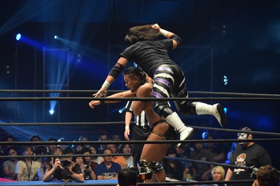 ポーリーがイスを持ってエプロンに上がるが彰人は佐々木をリリースして同士討ちを誘う(右写真)。
