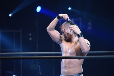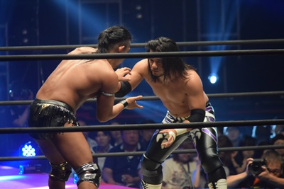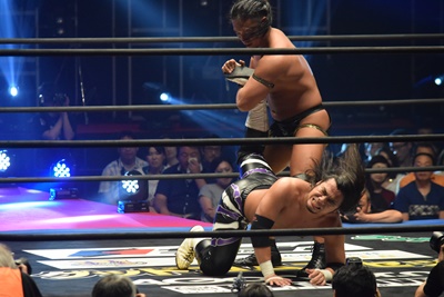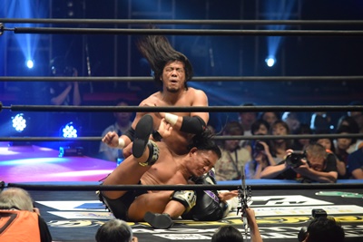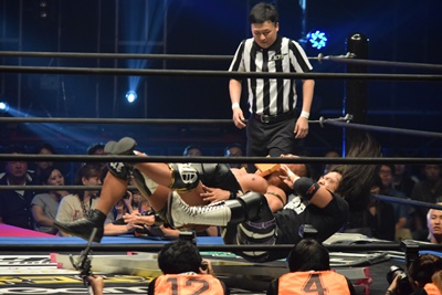 佐々木が立ち上がると彰人バック取ってジャーマンの体勢、佐々木サムソンクラッチで丸め込み(右写真)、