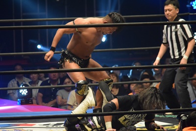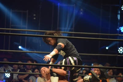 彰人ロープに飛ぶ、佐々木カウンターのドロップキック(右写真)。
