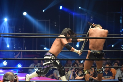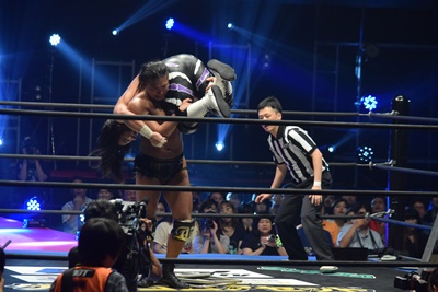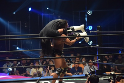 佐々木がイスを組み上げるが彰人は佐々木をその上にニークラッシャー、そしてドラゴンスクリュー(右写真)。