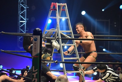 佐々木はリング内にラダーを設置、上る、彰人起き上がって足をつかむと(左写真)ドラゴンスクリュー。