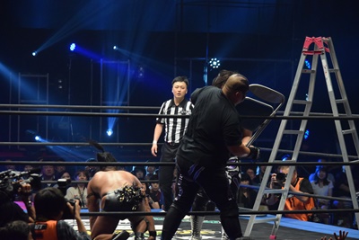 佐々木急所蹴りで形勢逆転、イスをフルスイング(右写真)。