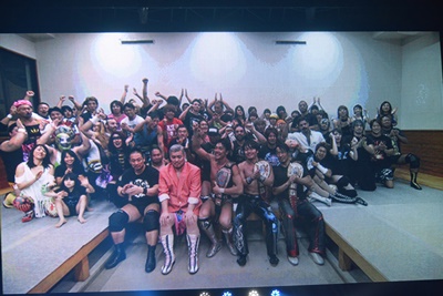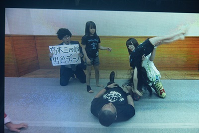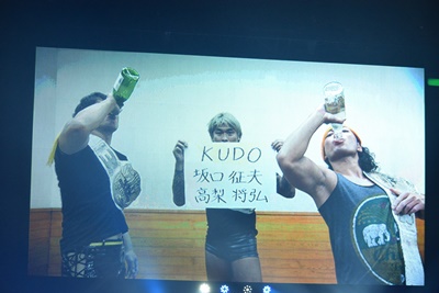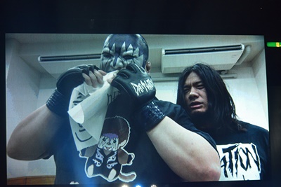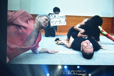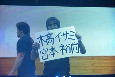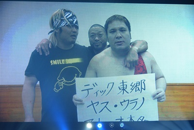 高木三四郎vs男色ディーノ。ディーノはおらず鶴見亜門・元GMがクビ撤回を土下座して願う(左写真)。