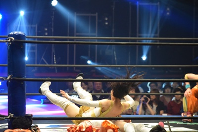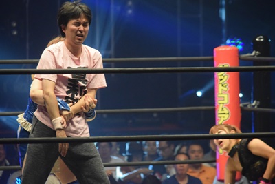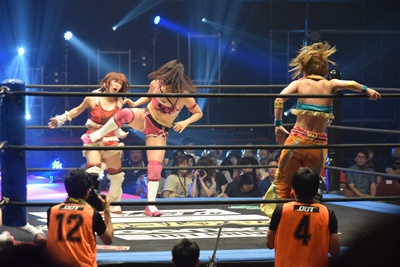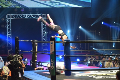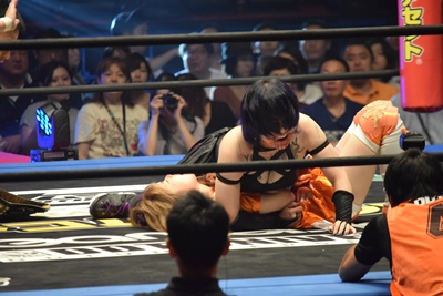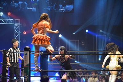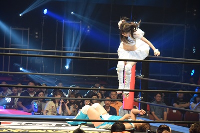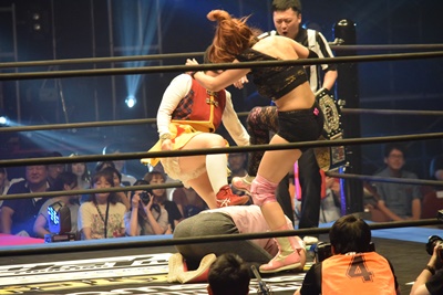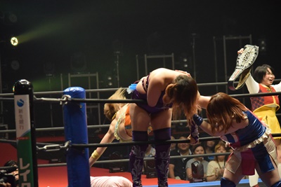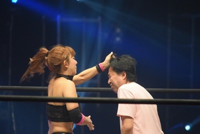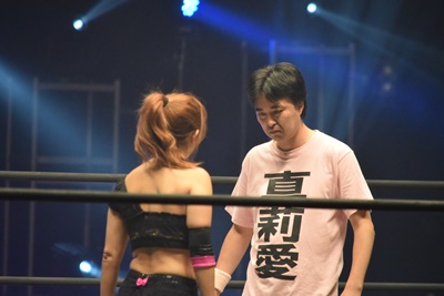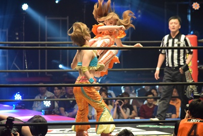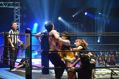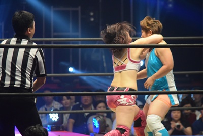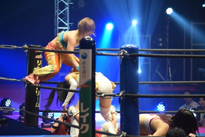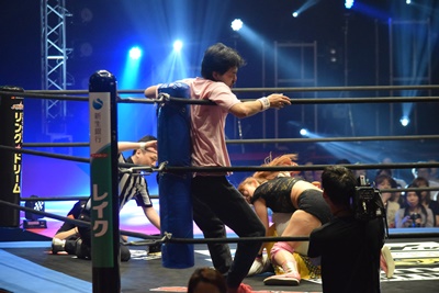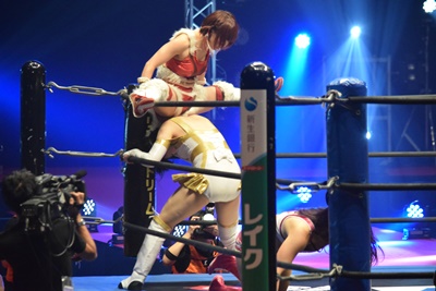 山下前蹴りで優宇をコーナーに追い込んで突っ込む、優宇ショルダースルーで山下をエプロンに(右写真)。