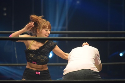 しかし反撃に出れるわけではなくチェリーの逆水平チョップを浴びる(右写真)。
