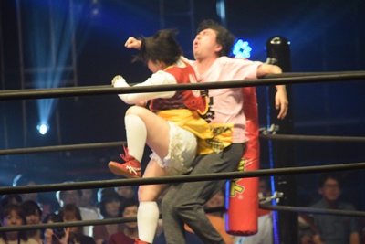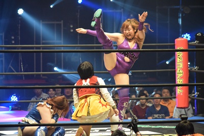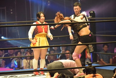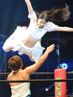 残り2人。みずぴょんが優宇にドロップキック(左写真)。