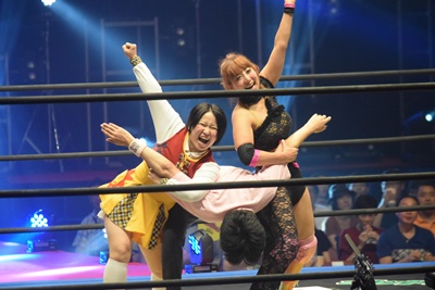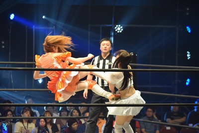 みらクりあんずが優宇にダブルのドロップキック(右写真)、