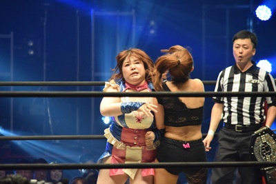 その直前にみずぴょんがキューティースペシャルでのどねえをフォール、王座移動(左写真)。