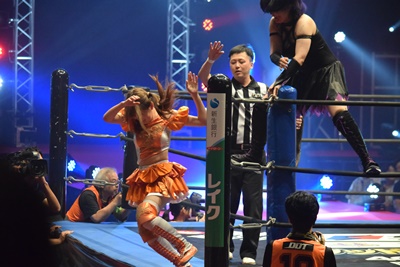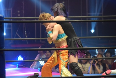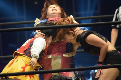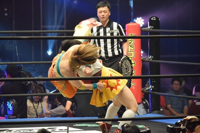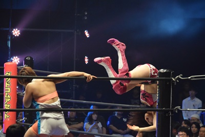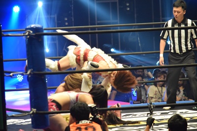 ユカッチロープに飛ぶ、まほキャッチしてスリーパー(左写真)、ユカッチロープエスケープ、そのまま場外に。