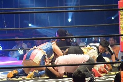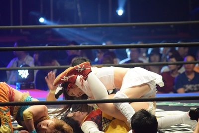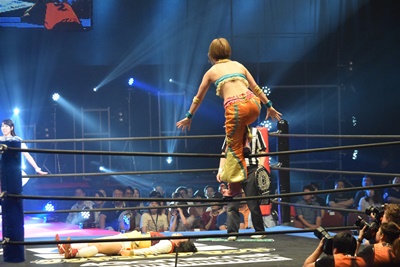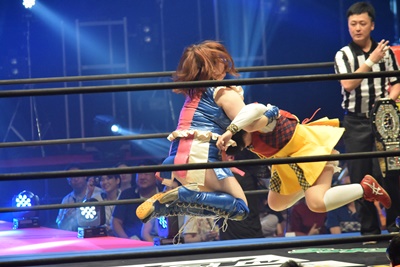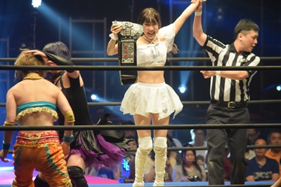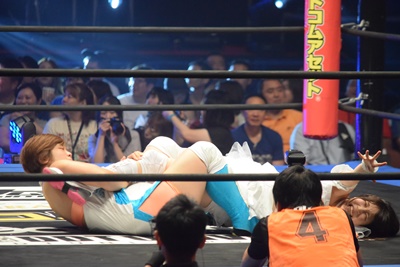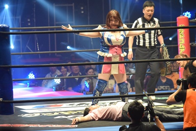魔法少女キック(右写真)。後ろでは甲田代表をフォールしたのどねえがベルト持って喜んでる。