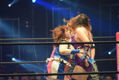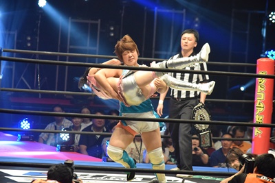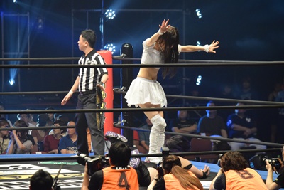 エプロンに出されたのの子がまなせをOTRで落とそうとする、そこに第6入場者の坂崎ユカが(右写真)。