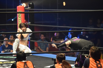 あずさ優宇とみずぴょんをコーナーに振って串刺しエルボー(左写真)、
