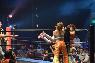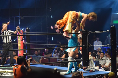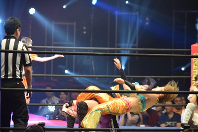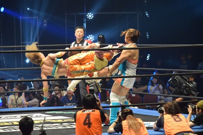 まほがロープ際の中島に突っ込む、中島ロープを引き下げてまほをエプロンに(右写真)。