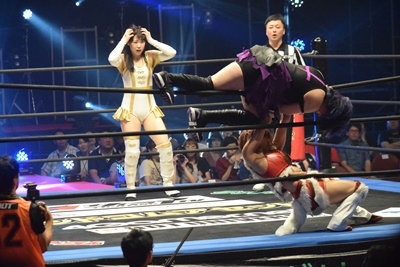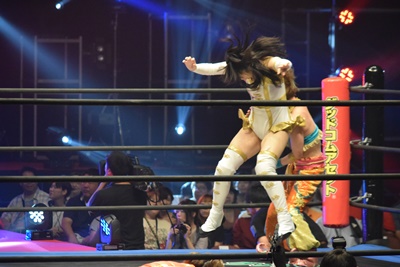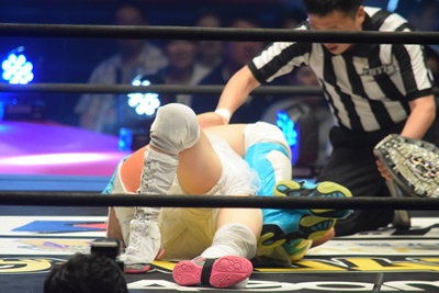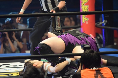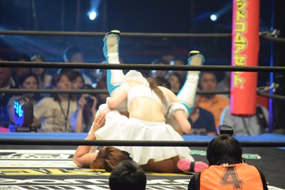 みずぴょんバックに回ってスクールボーイ(左写真)、カウント2。