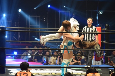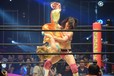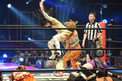 優宇あずさを持ち上げると旋回式サイドウォークスラム(右写真)、カウント3。