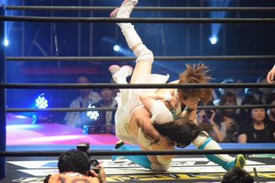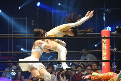 マリカがまほのラリアットかわしてフライングネックブリーカードロップ(左写真)。