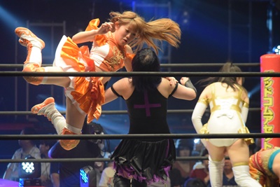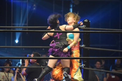 魔法少女スプラッシュ(左写真)、しかしそこに入って来た第7入場者の瑞希がカット。ユカッチ怒ってみずぴょんを場外に(not OTR)。