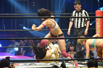 リカがユカッチをコーナーに振るとまほが串刺しラリアット(左写真)、