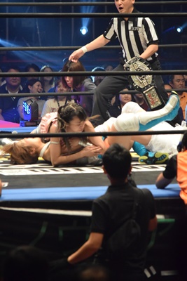 まなせ場外転落、のの子も引きずられて場外に(左写真)。