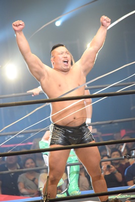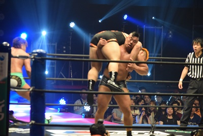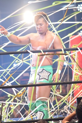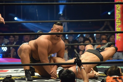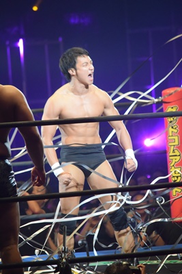 ここから本戦。本日デビュー、ラグビー出身の飯野雄貴が入場(右写真)。
