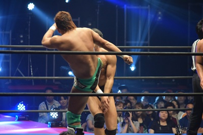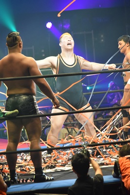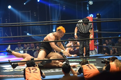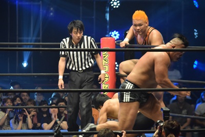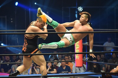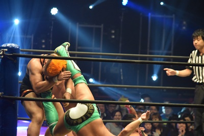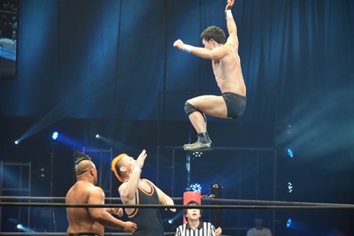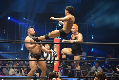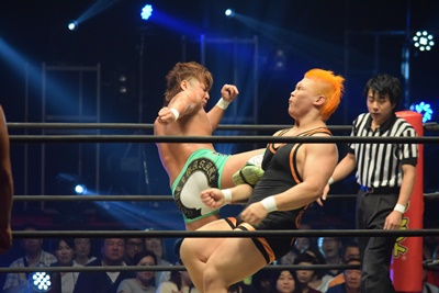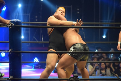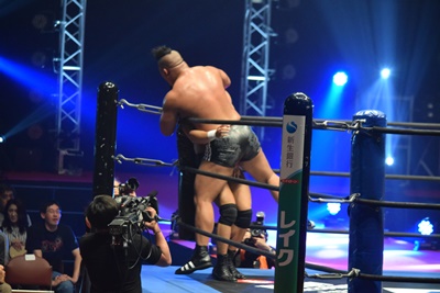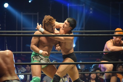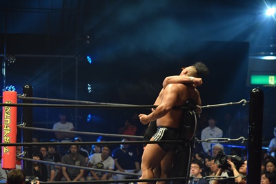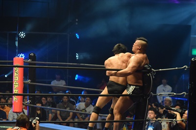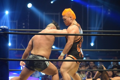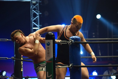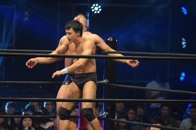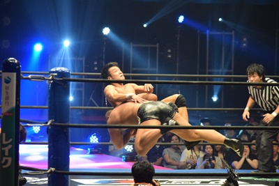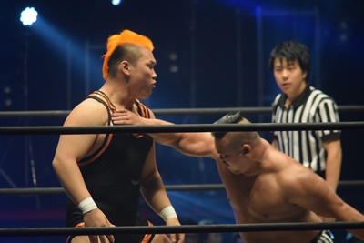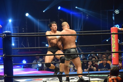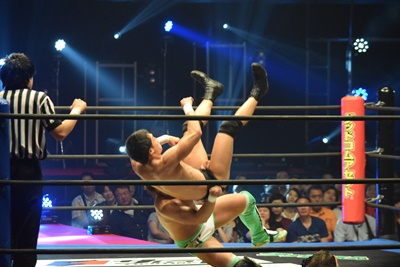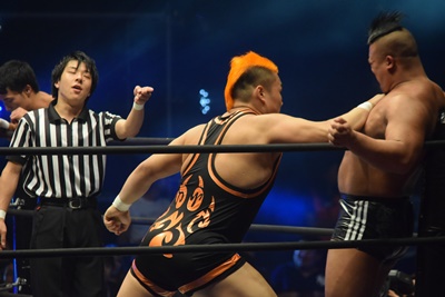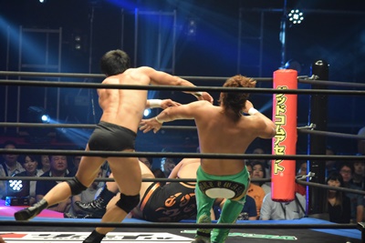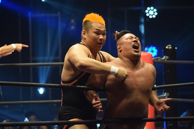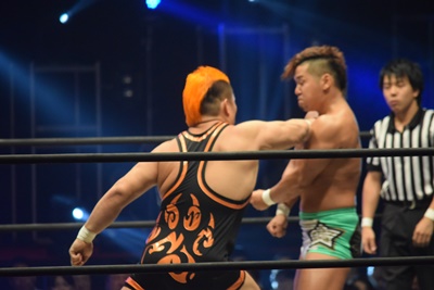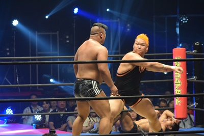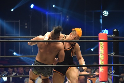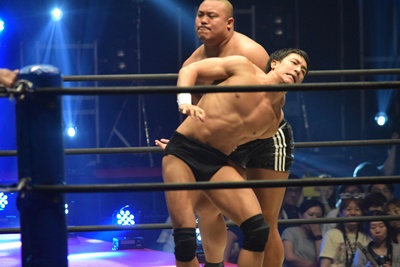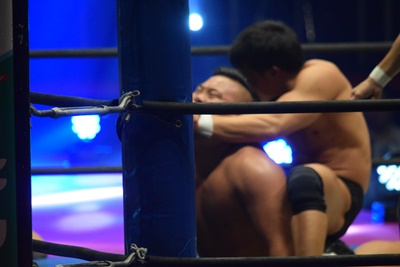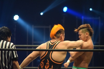 上野ロープに振る、飯野ショルダーブロック(左写真)で倒す。両軍タッチ。