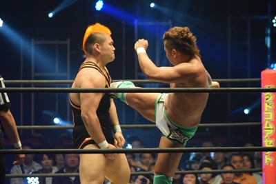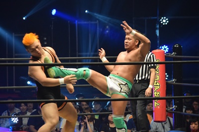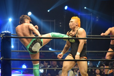 上野ミサイルキック(右写真)、吉村にタッチ。