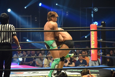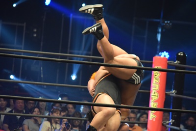 逆水平の打ち合いから吉村ブレーンバスター狙う、飯野切り返して逆にブレーンバスター(右写真)、岩崎にタッチ。5分経過。