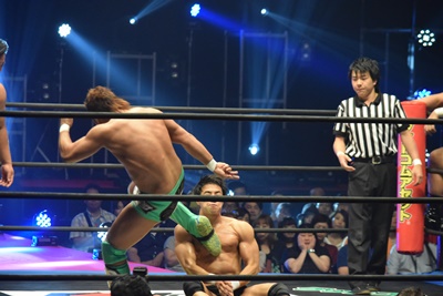 飯野肩に担いでバックフリップ(左写真)、カバー、カウント2。