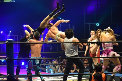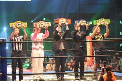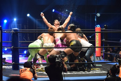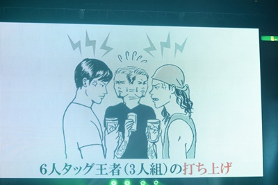 6人タッグ王者(3人組)の打ち上げ(左写真)は、