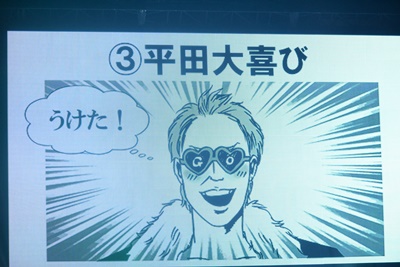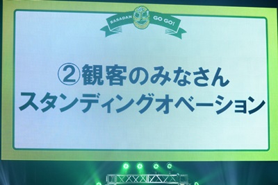 すると観客のみなさんが平田にスタンディングオベーション(左写真)。