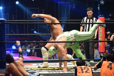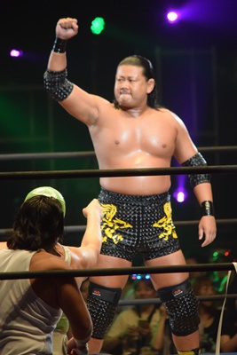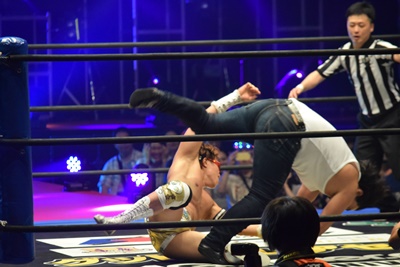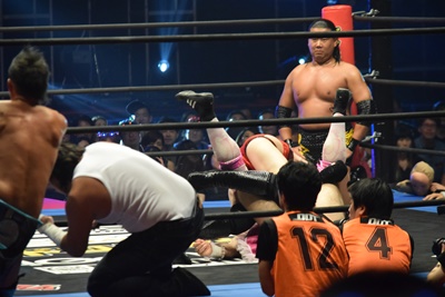 ヨシヒコはカバーに来た大石の足を取って片逆エビ固めに(右写真)、大家カット。