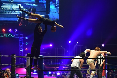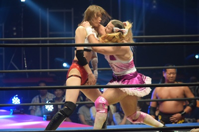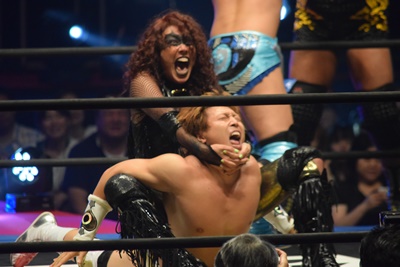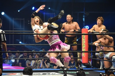 LiLiCoが入ってキャメルクラッチに(右写真)、その顔面に大石がドロップキック。大家にタッチ。