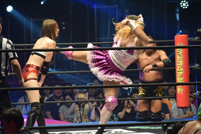 ビアちゃんキック連打、ロープに飛ぶ、沙希ちゃんカウンターのビッグブーツ(右写真)。