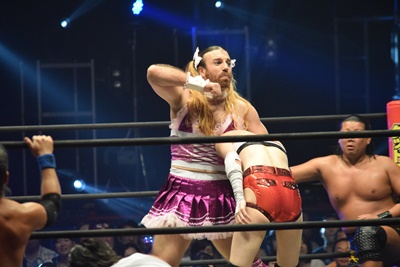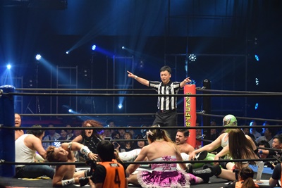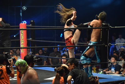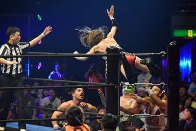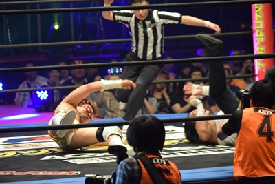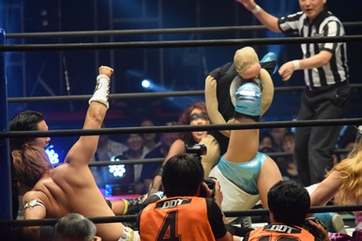 喜ぶ平田をLiLiCoがスクールボーイ(右写真)、しかしカウントは2。作戦終了。