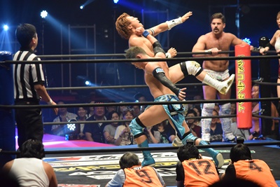 大家ロープに飛ぶ、平田カウンターのドロップキック(左写真)。