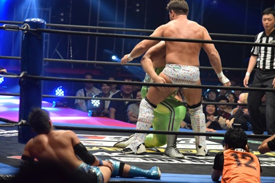 大石こらえてパワーボムで叩きつける(左写真)。