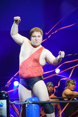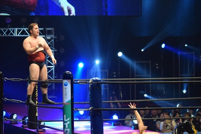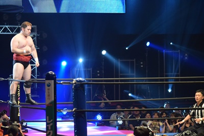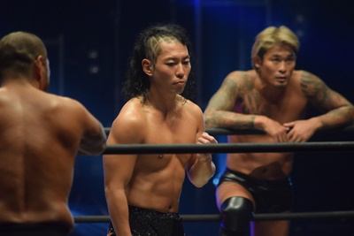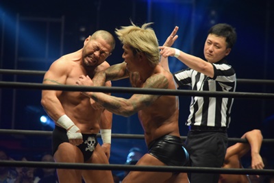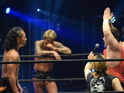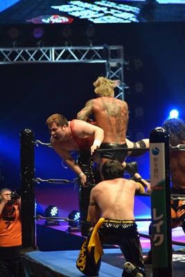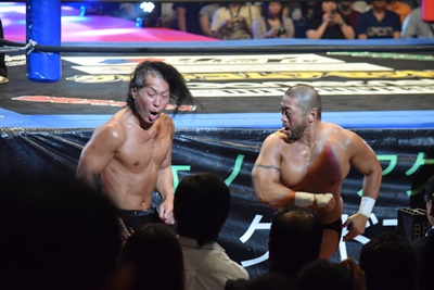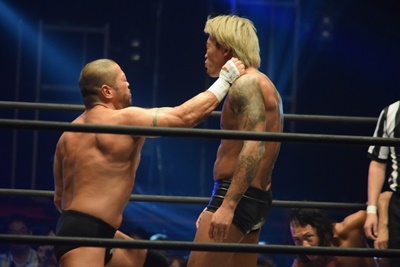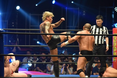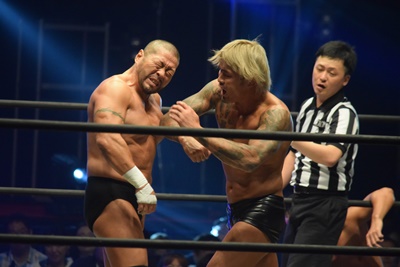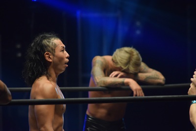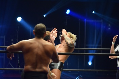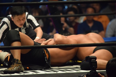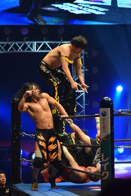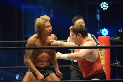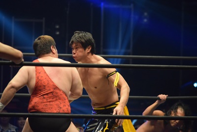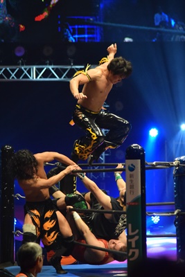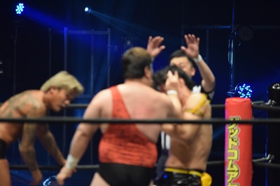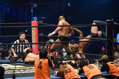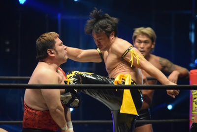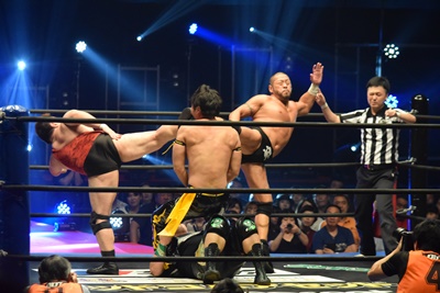 ウラノがシーソーホイップの要領で持ち上げたところに東郷とアントンがダブルのトラースキック(左写真)、アントンがカバー、カウント2。