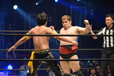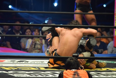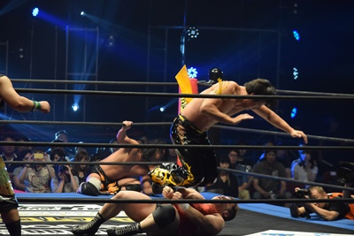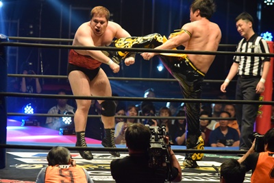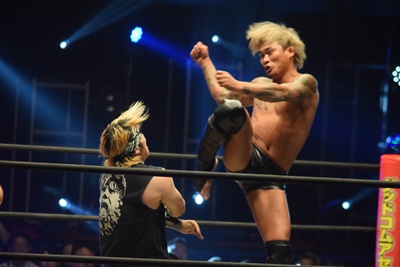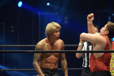 ウラノ低空ドロップキック(左写真)、東郷にタッチ。
