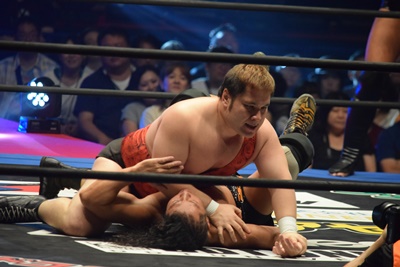 アントンKUDOにドラゴンスープレックス(右写真)、カウントは2。