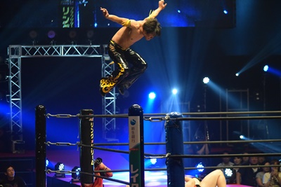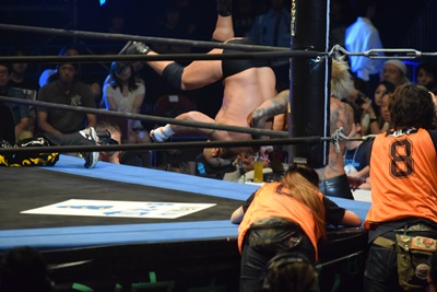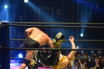 ウラノ高梨をトップロープに引っ掛けて背中にドロップキック(右写真)、カウント2。