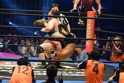 東郷ショルダースルーで坂口を場外に落とし(右写真)、