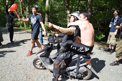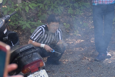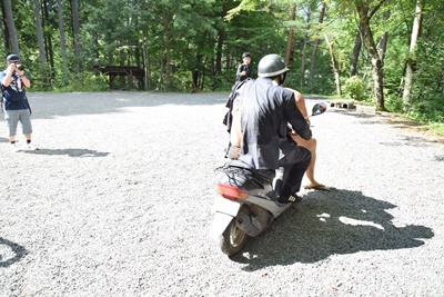 スタート地点の白樺広場に戻ると澤がバイク乗り回していた(右写真)。